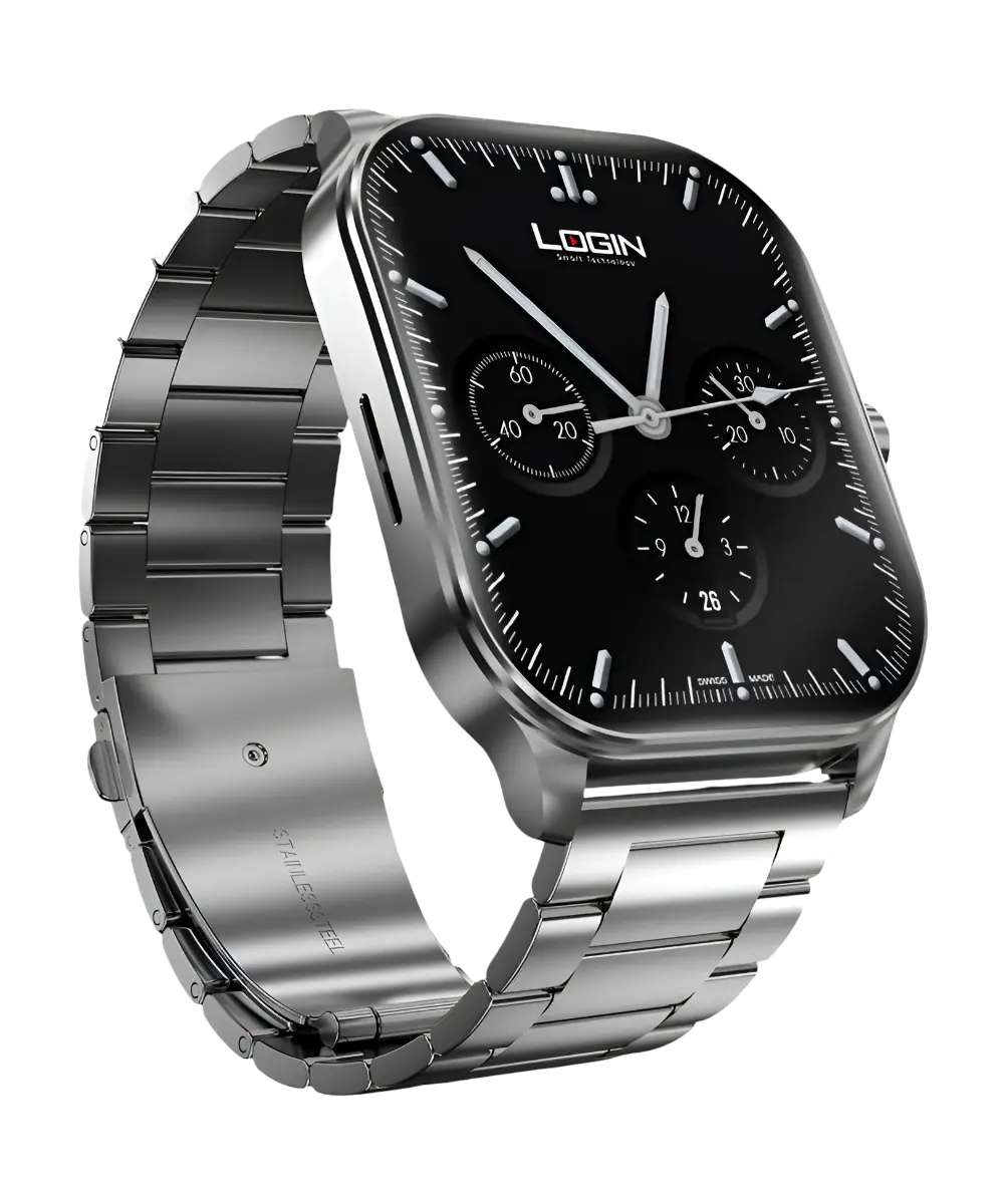 Experience the perfect blend of style and technology with the Login L-104 Elite Smart Watch featuring a 1.96″ AMOLED display, Bluetooth calling, 100+ sport modes, and advanced health monitoring including heart rate and blood oxygen tracking. This water-resistant smartwatch with metallic design offers seamless Android and iOS compatibility, customizable watch faces, and exceptional battery life.